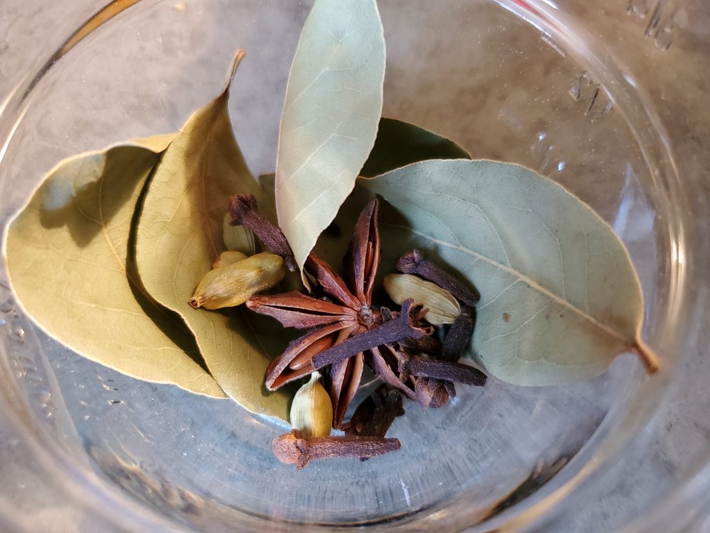 The biryani is made by marinating the chicken in an abundance of spices and yogurt with fresh ginger and garlic. While this sits the rice is cooked in a pot of water with whole spices of star anise, bay leaves, cardamom, and cloves.