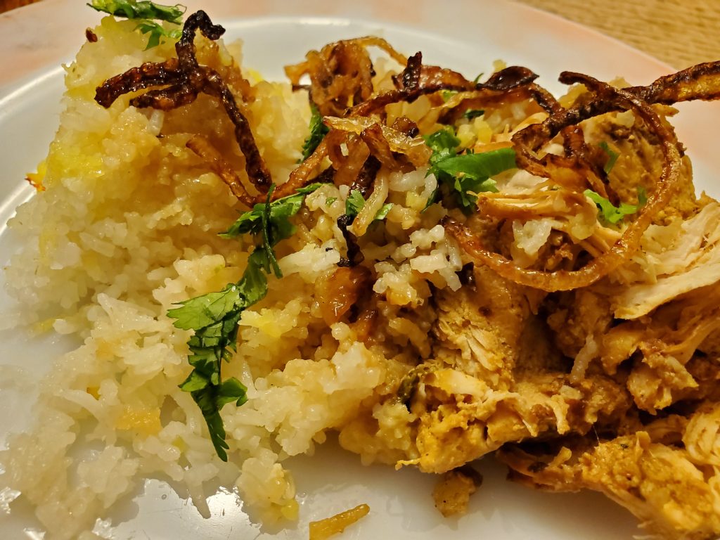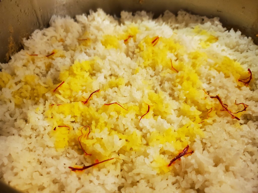 Once the rice and chicken have been partially cooked the dish is put together, and then cooked once more. The bottom consists of the chicken and sauce, then half of the fried onions we’d made, and some cilantro, topped of with the rice and drizzled with saffron that had been soaking in water. The remaining onions and cilantro was set on the table to add as desired. This main course was enjoyed by all and there will be no leftovers.
