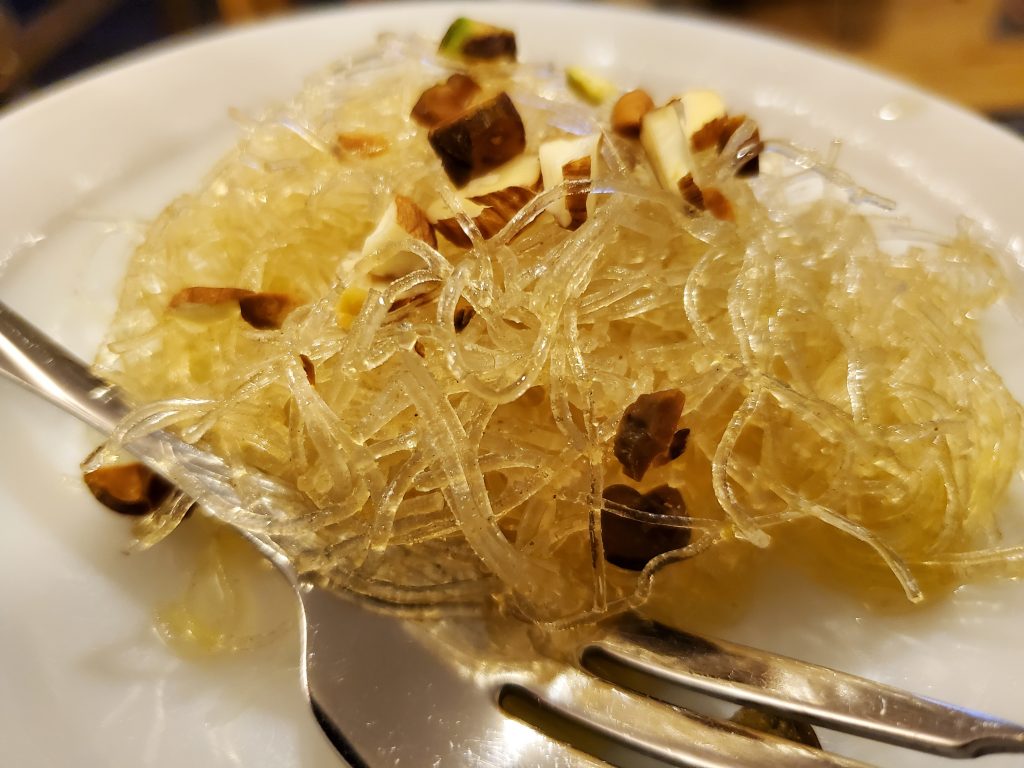 This dessert consisted of ghee cooked with ground cardamom to which we added vermicelli and then water and sugar. This was pleasantly sweet and I’m sure would have a good flavour if not for the strong ghee taste. At least that’s what I figure it was as we’ve never used it before. This was also garnished with almonds as well as pistachios.